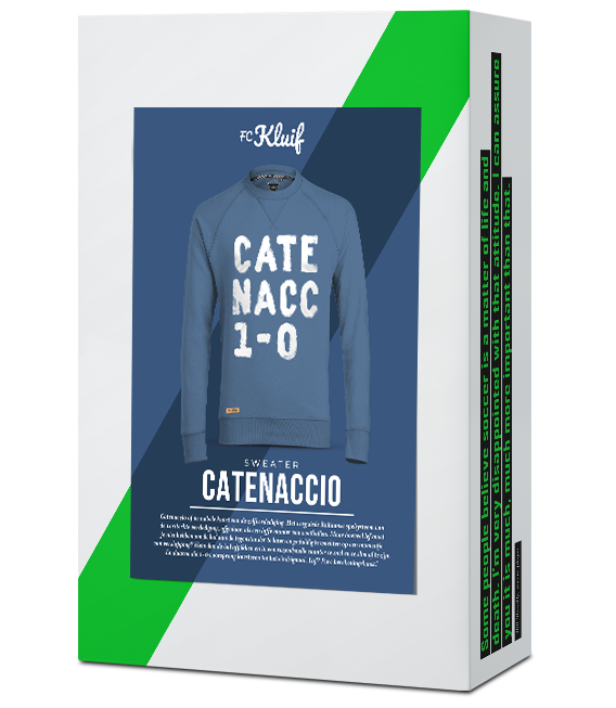 We kennen de standaard voetbalshirts met supersterren wel. Wat is er voor de échte fan? De liefhebber van de buitenbeentjes en de zwarte voetbalschoen. Daarvoor is FC Kluif. Wij maken originele voetbalkleding voor voetbalgekken. Deze stijlvolle sweater is gemaakt van 100% katoen. Een zachte, soepel vallende sweat-kwaliteit die lang meegaat. Hij is beschikbaar in twee kleuren: blauw en antraciet. Over de gehele voorkant van de sweater vind je in het wit de tekst Catenacc1-0. Laat hierover geen misverstand bestaan! Maar let ook op de details; mooi afgewerkte FC Kluif logo’s aan de binnenzijde van de nek en een geweven label aan de onderkant van de sweater.